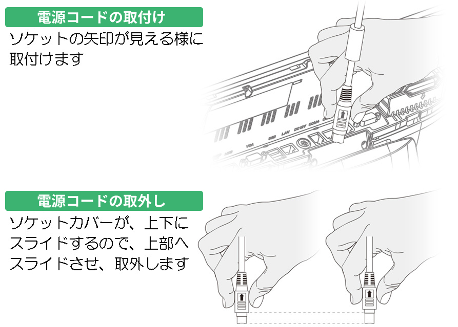 電源ケーブルの取付け、または取外しの必要がある場合は図のように行ってください。