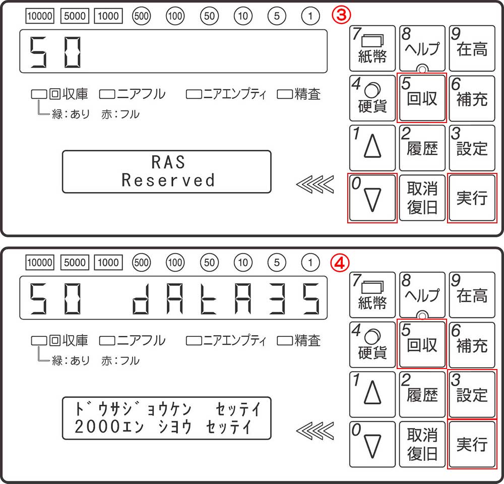 3-RASモードに入りますので「5」「0」「実行」の順に押します 4-2000エンシヨウセッテイになりますので「3」「5」「実行」の順に押します