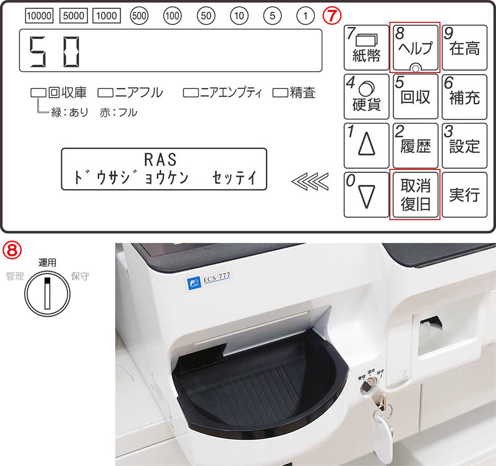 7-「取消し復旧」を押しながら「ヘルプ」を長押しします 8-鍵を「運用」に戻して終了です
