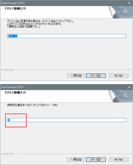 7 - デバイス情報入力、デバイス名「次へ」を押します 8 - デバイス情報入力、ポート 設置設定マニュアルでは、COMポート1番へ、連動ケーブルを接続する事になっています COM1以外の場合、利用するポートNoを入力します