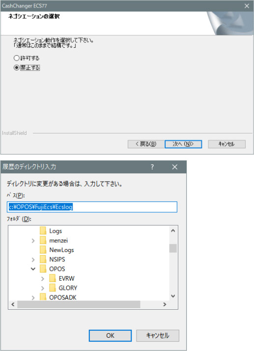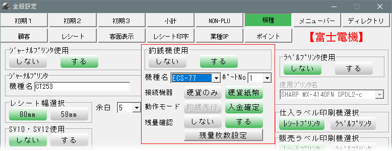 全般設定>「機種」の・釣銭機使用「する」に ・機種名: [ECS-77]を選択 ・ポートNo: POSの釣銭機と接続されているポートNoを設定します ・動作モード: 選択不可