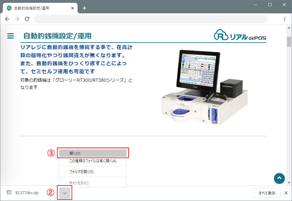 2-ダウンロード後ブラウザの左下ECS77drv.zip[∧]をクリック 3-「開く」を押します