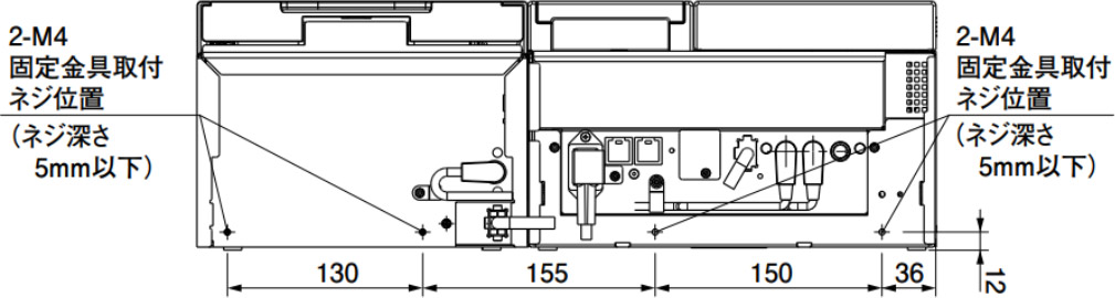 注)必ず固定金具を使用して,本機を固定してください。 本機を固定しないと,内部ユニットを引き出した時に,前倒・落下 の恐れがあります。 固定金具は設置前に準備してください。 ① 固定金具を,4カ所にそれぞれ取 り付けてください。 ねじ長さは本体への入り込み深さ が 5mm 以下になる長さとしてく ださい。 ② 固定金具を設置台に固定してくだ さい