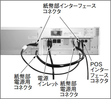 ③ 各ケーブルを下記のように接続し てください。 ●電源コードを電源インレットに 接続してください。 ●硬貨-紙幣間電源ケーブルを紙 幣部と硬貨部の紙幣部電源用コ ネクタに接続してください。 ●硬貨-紙幣間通信ケーブルを紙 幣部と硬貨部の紙幣部インター フェースコネクタに接続してく ださい。 ● POS からのケーブルを POS インターフェースコネクタに接 続してください。