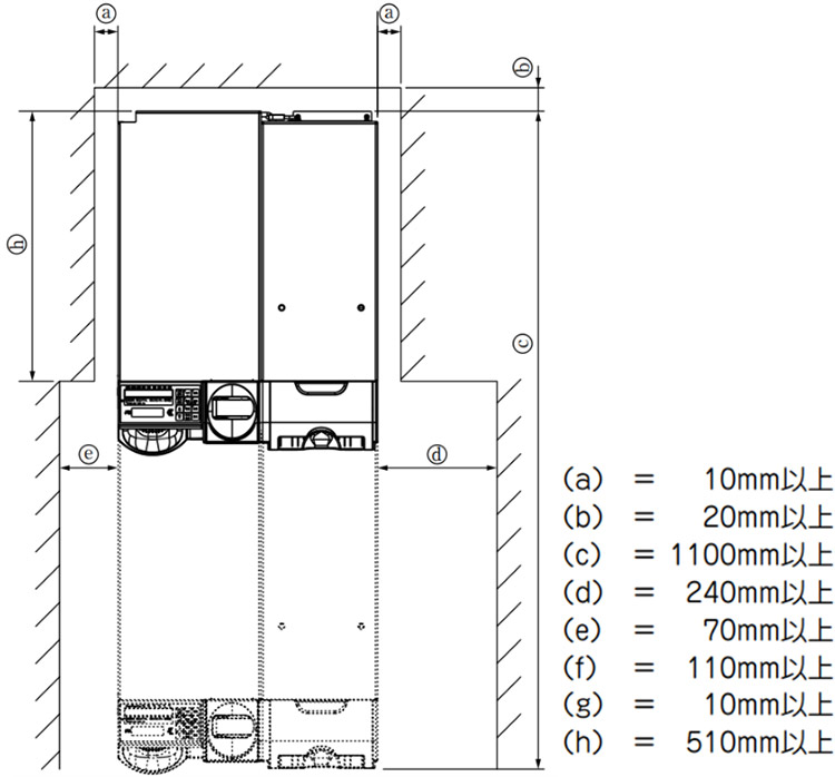 本製品を設置する時は,内部ユニットの開閉と放熱のために,次に示すスペースを確保してください。 放熱が悪いと故障の原因になります。