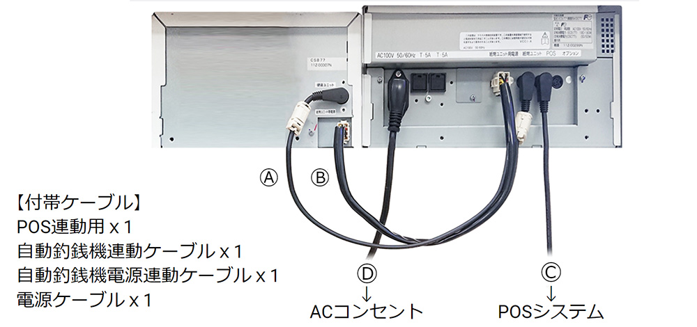 Ⓐ紙幣硬貨釣銭機連動用ケーブルを接続 Ⓑ自動釣銭機 電源連動用ケーブルを接続 ⒸPOS連動ケーブルを本体とPOSに接続(COM1) ※COM1以外に差した場合、設定画面のCOMを合わせる Ⓓ電源ケーブルを接続し電源ケーブルをACコンセントへ接続