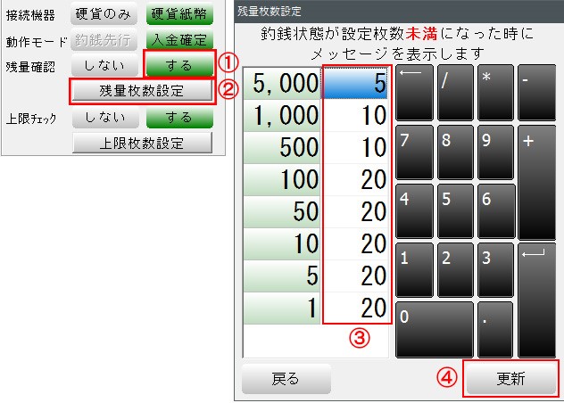 1-「残量確認」をするにします 2-「残量枚数設定」を押します 3-残量枚数を設定します 4-「更新」を押します 「戻る」を押して、機種画面で「更新」を押して終了です 釣銭が設定枚数を割り込むと、BCPOSの画面にメッセージを表示します