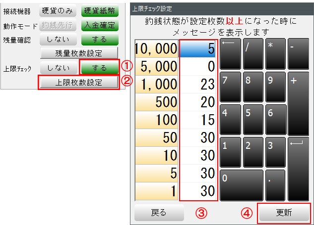 1-「上限チェック」をするにします 2-「上限枚数設定」を押します 3-上限枚数を設定します 4-「更新」を押します 「戻る」を押して、機種画面で「更新」を押して終了です 釣銭が設定枚数を超えると、BCPOSの画面にメッセージを表示します 富士電機 釣銭機 上限(収納カセットを1万円で設定)
