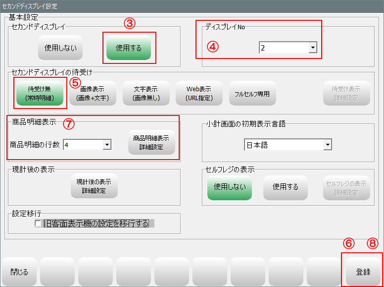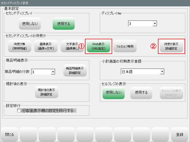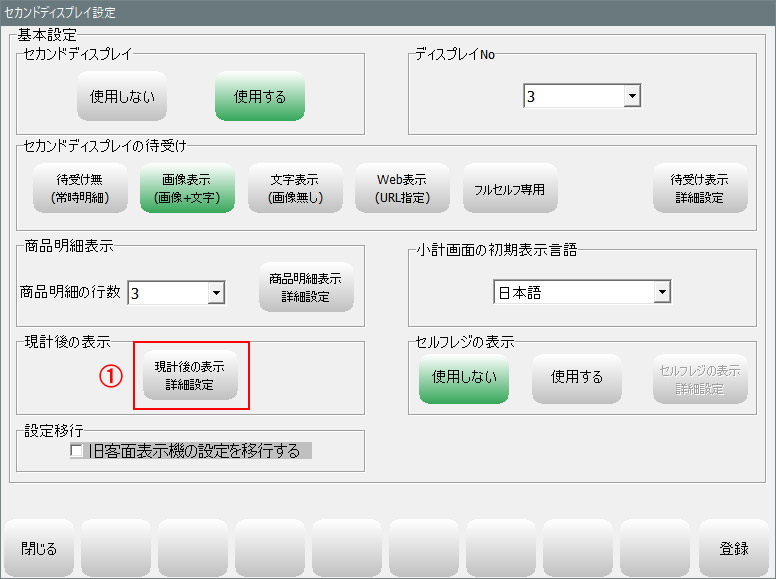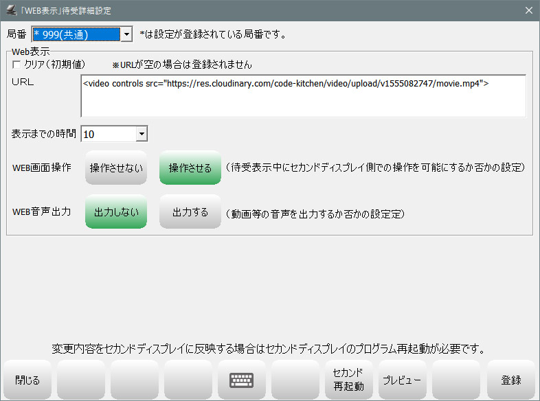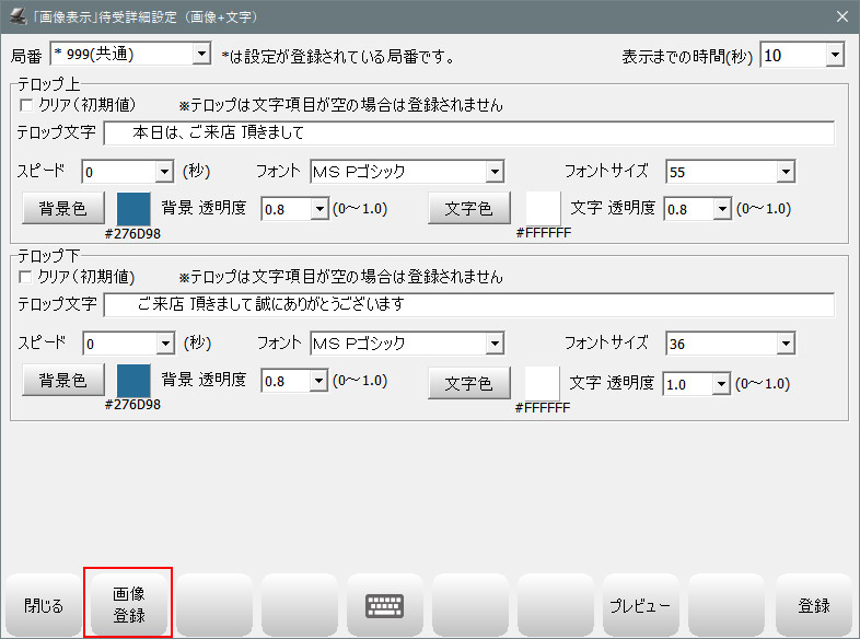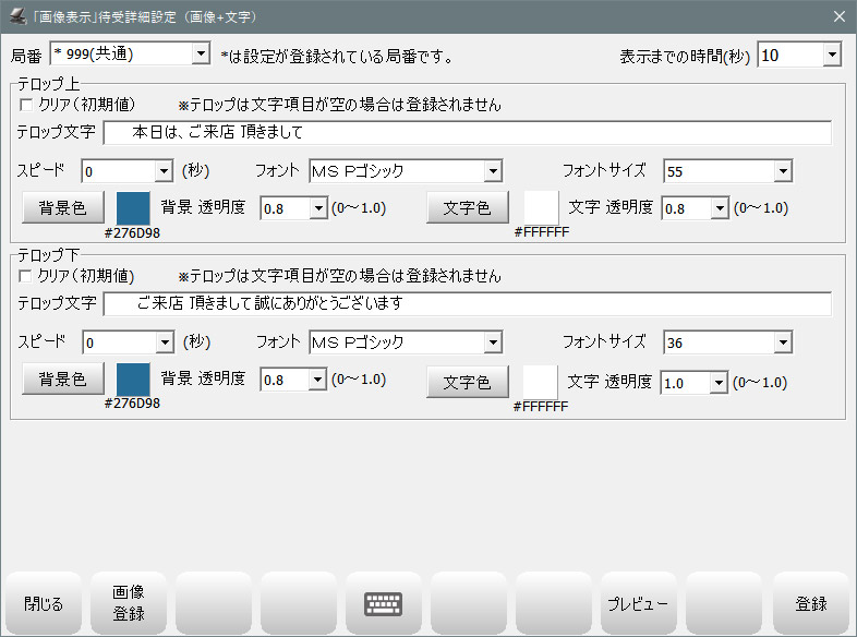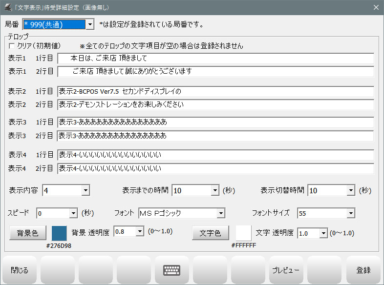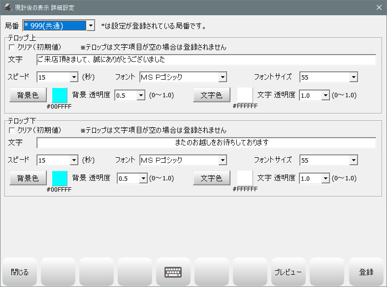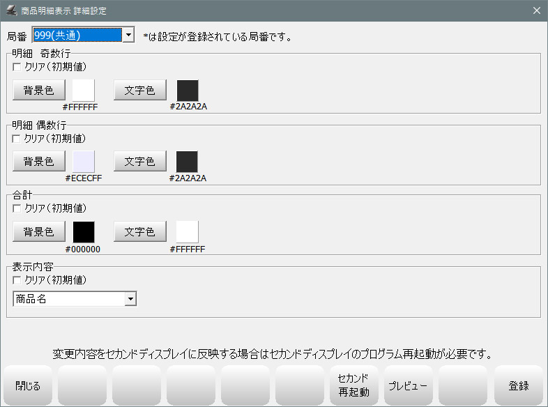 | 局番 | *999(共通)では、レジの全局共通設定です。局番を指定して設定すると局番毎に表示内容を設定できます。 |