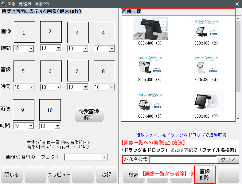 | 画像登録 | 画像登録画面が開きます。待受で表示される画像をドラッグアンドドロップで割当できます。 |