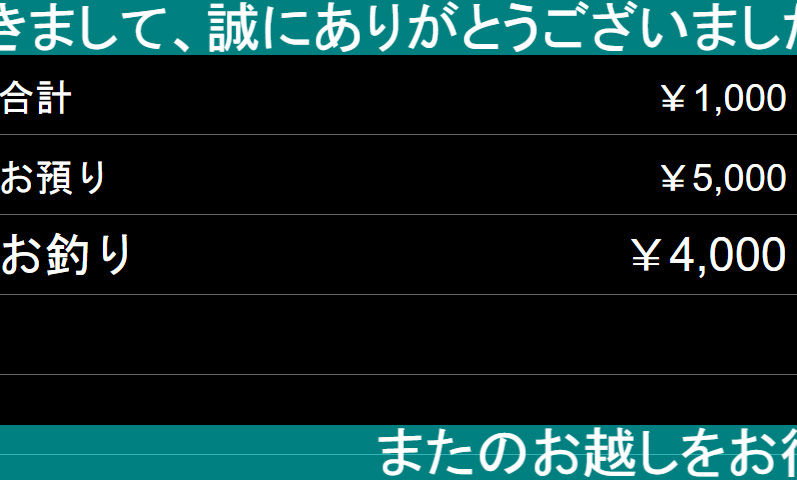 | 文字 | 現計後にメッセージ表示する場合設定します。 |