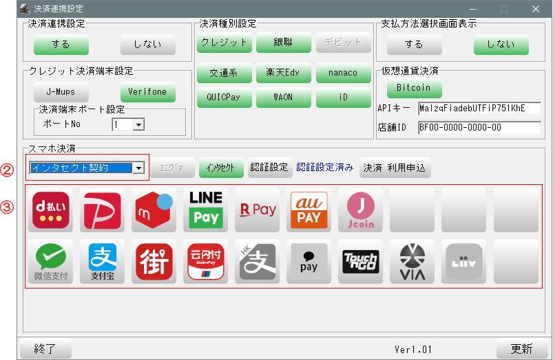 ③-インタセクト加盟店契約で、利用可能な決済アイコンが全てONになります。契約していない決済アイコンをOFFにしてください。