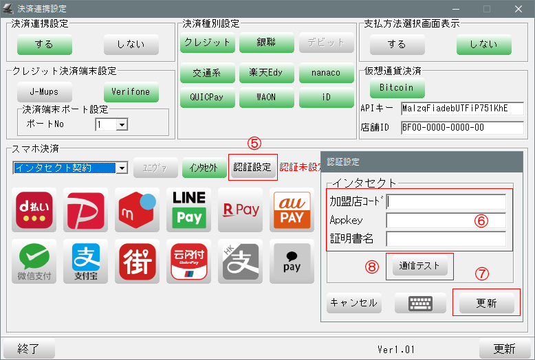 ⑥-「加盟店コード」「Appkey」を入力し、「証明書PW」を「証明書名」へ入力します。