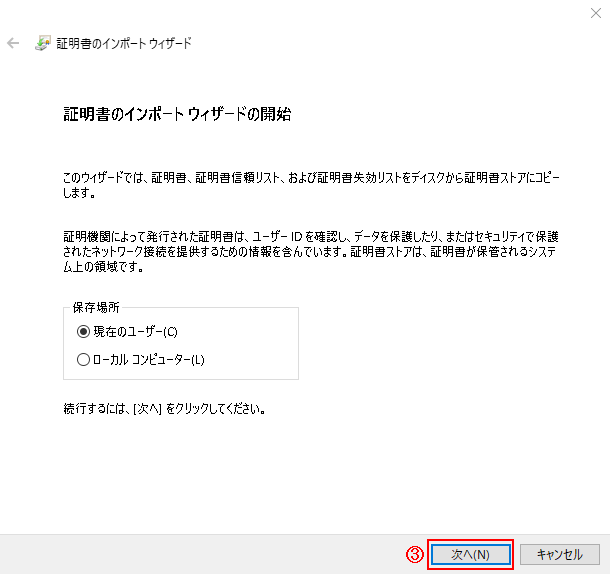 ②-QR決済を使用するBCPOSのPCで、①の証明書ファイルをダブルクリックします。