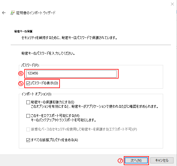 ⑥-「接続情報連携_会社名.txt」に記載されている「証明書PW」を入力します。
