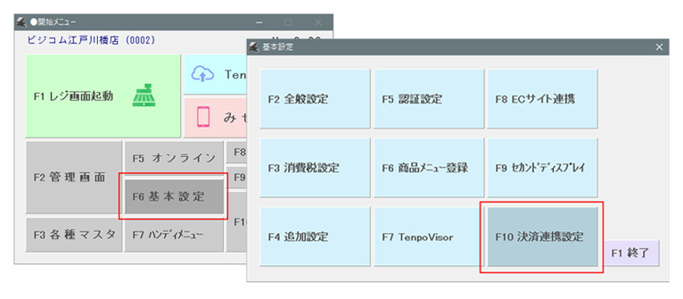 ①-開始メニュー>「F6 基本設定」>「F10 決済連携設定」を開きます。