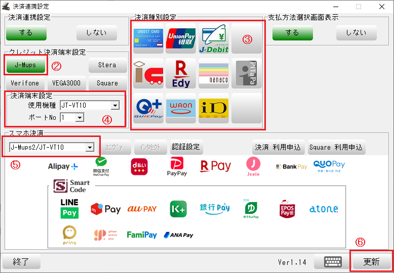 ⑤-スマホ決済を契約している場合は「J-Mups2/JT-VT10」を選択します。
