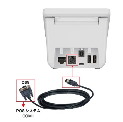 ②-POS連動ケーブルのDB9をPOSの「COM1ポート」へケーブルを接続します。