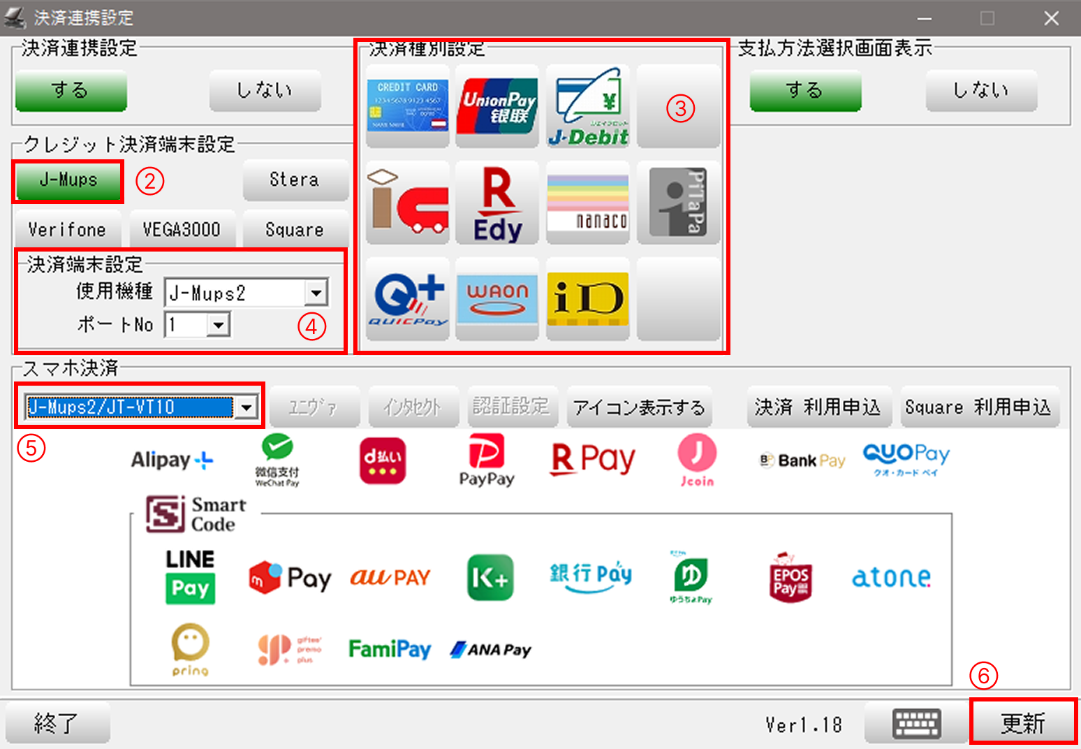 ⑤-スマホ決済を契約している場合は「J-Mups2/JT-VT10」を選択します。