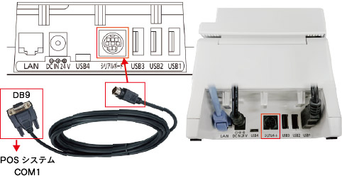 ②-POS連動ケーブルのDB9をPOSの「COM1ポート」へケーブルを接続します。