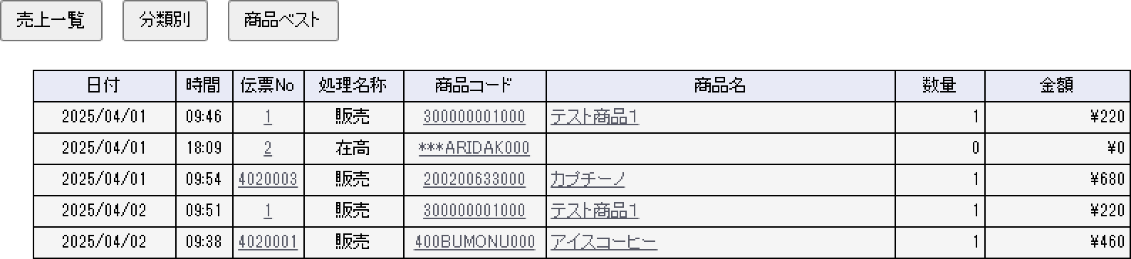 処理種別 期間と店舗(単店)を指定すると、指定範囲内の POS 処理内容(販売・仕入・移動など)を処理順に確認できます。 処理時刻、伝票No、商品コード・名、数量、合計金額が表示され店舗で行われた操作内容を把握できます。 また、日付別・日付と伝票別・商品別の小計表示が可能です。