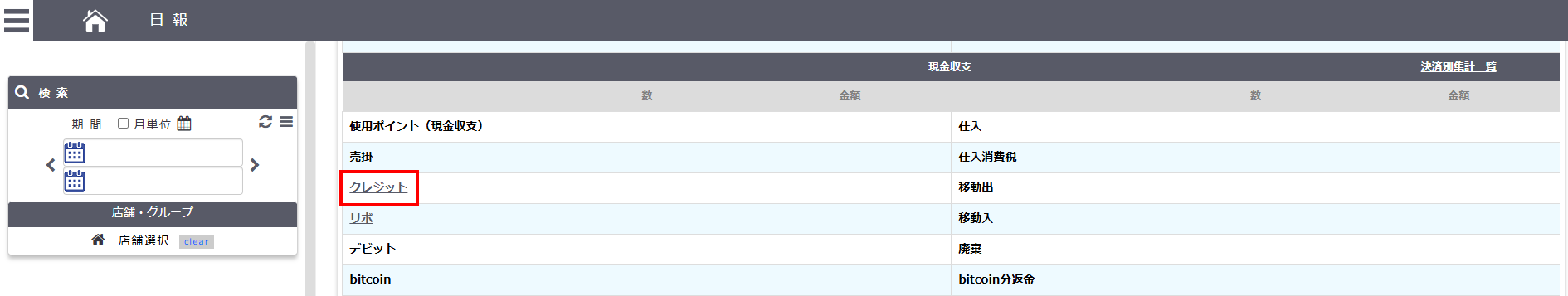 こちらで登録したクレジット会社は 売上管理-全体の、クレジット別画面にてクレジット会社名として反映されます。