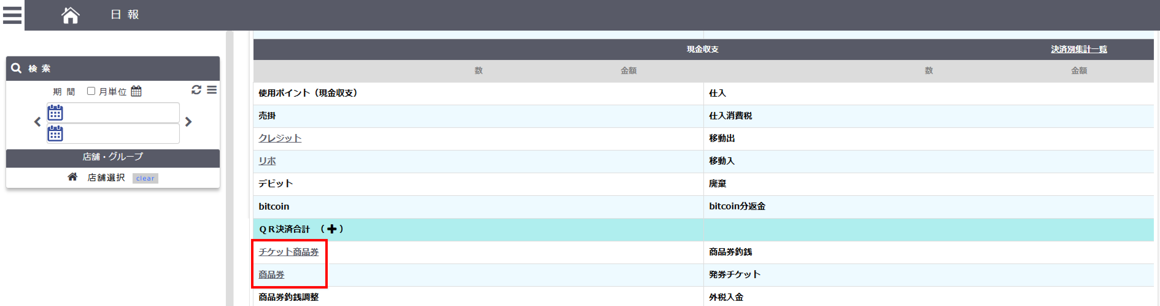 こちらで登録した商品券名は売上管理-全体の、商品券・チケット別画面にて商品券名として反映されます